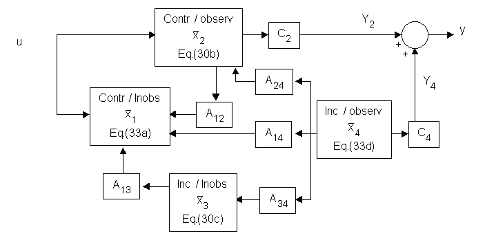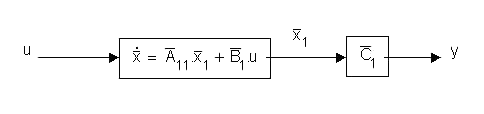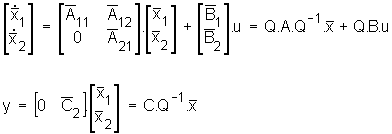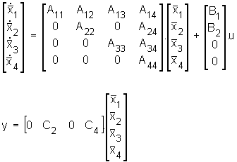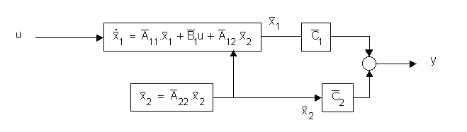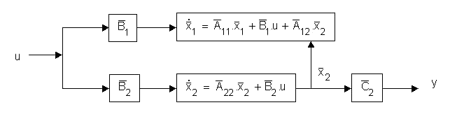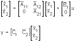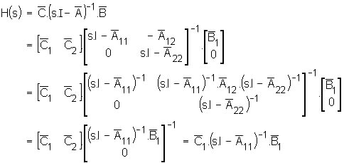 Isto confirma o que foi visto no exemplo acima. É claro que a parte incontrolável não contribui para a matriz de transferência, uma vez que esta é uma relação entre resposta e controle, com condições iniciais nulas.