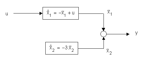 Ora, do diagrama de blocos acima, é claro que o 2o sub-sistema não contribui para a função de transferência. Vamos conferir isto, calculando a função de transferência na representação de estado original: