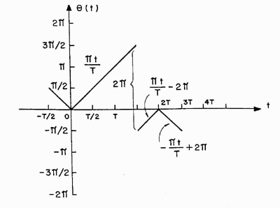 Como as componentes em fase e em quadratura do sinal MSK, de acordo com (119) e (120), não apresentam descontinuidades, a fase do sinal MSK também é contínua. Assim, os valores das constantes l 2k e l 2k+1 devem ser tais que garantam esta continuidade. A Figura 33 ilustra a variação da fase do sinal MSK.