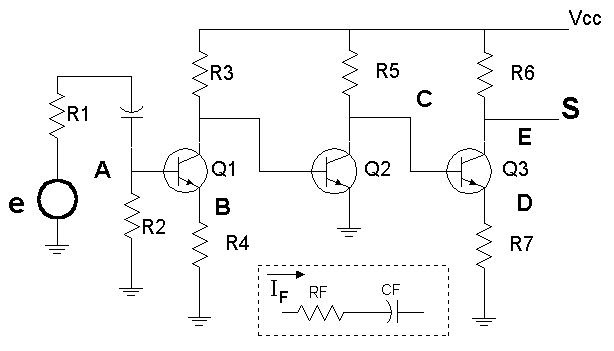 São 3 estágios inversores, saida defasada de 1800, com realimentação entre coletor e base, semelhante ao caso já visto no exemplo 2. A realimentação é negativa.