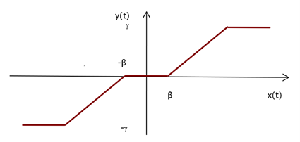 A real amplifier exhibits a dead zone and saturation in its input-output relation. The dead zone means that there is an interval of input values that yield a null output. The saturation means that for magnitudes of the input higher than a certain value the output is constant. It is the case of an amplifier with dead zone and saturation, characterized by the graphic and the analytic expression that follow. Observe that the graphic is a piecewise linearized.